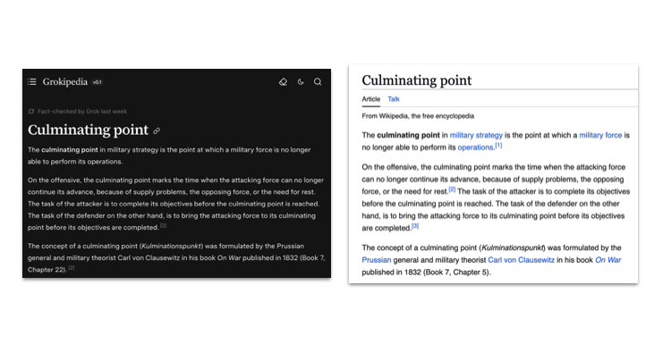 Sometimes Grokipedia botches citations. In the entry for "culminating point," Grokipedia cited the wrong book chapter in which military theorist Carl von Clausewitz introduced the concept. The rest of the article text is copied from Wikipedia.