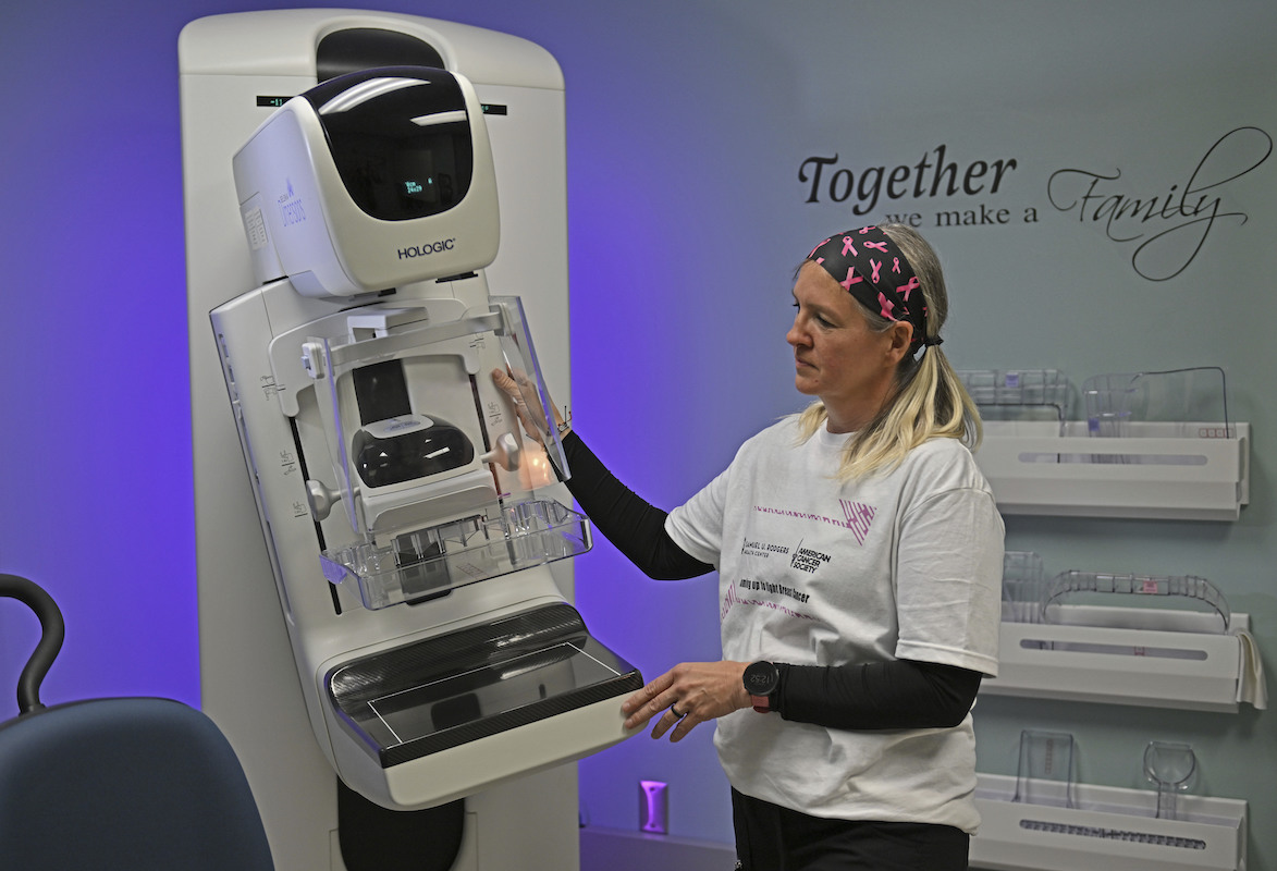 Renee Jeria, the imaging manager, shows the working of the mammography screening machine at the Samuel U. Rodgers Health Center on April 25, 2023 in Kansas City, Mo. (AP)