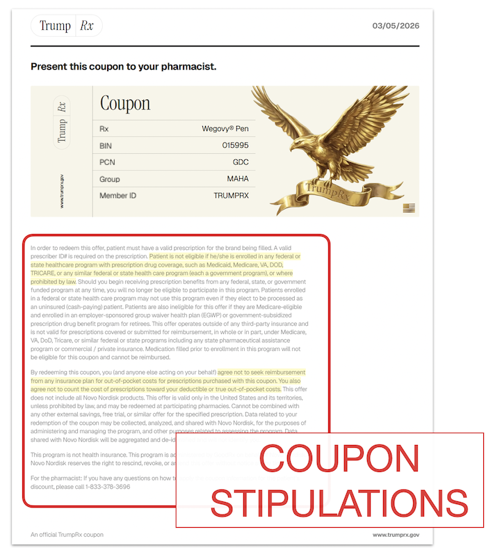 The TrumpRx website includes information about how the discounts can be used with stipulations listed in small text beneath the downloadable coupons. (Screenshot from TrumpRx.gov)