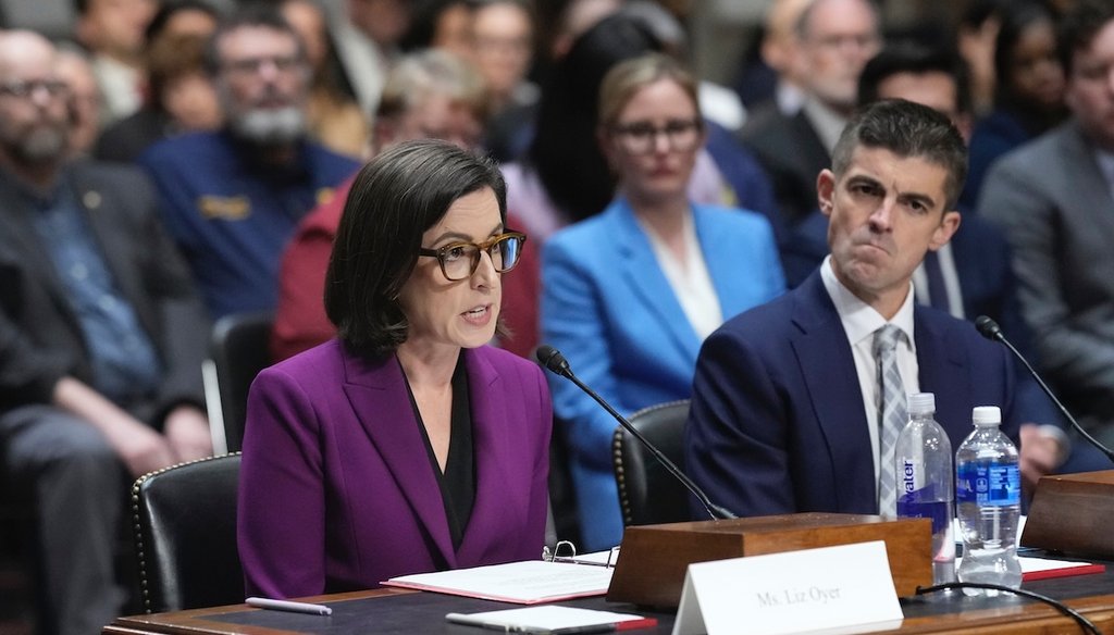 Former Justice Department attorneys Liz Oyer, left, and Ryan Crosswell participate in a hearing on the Justice Department on April 7, 2025. (AP)