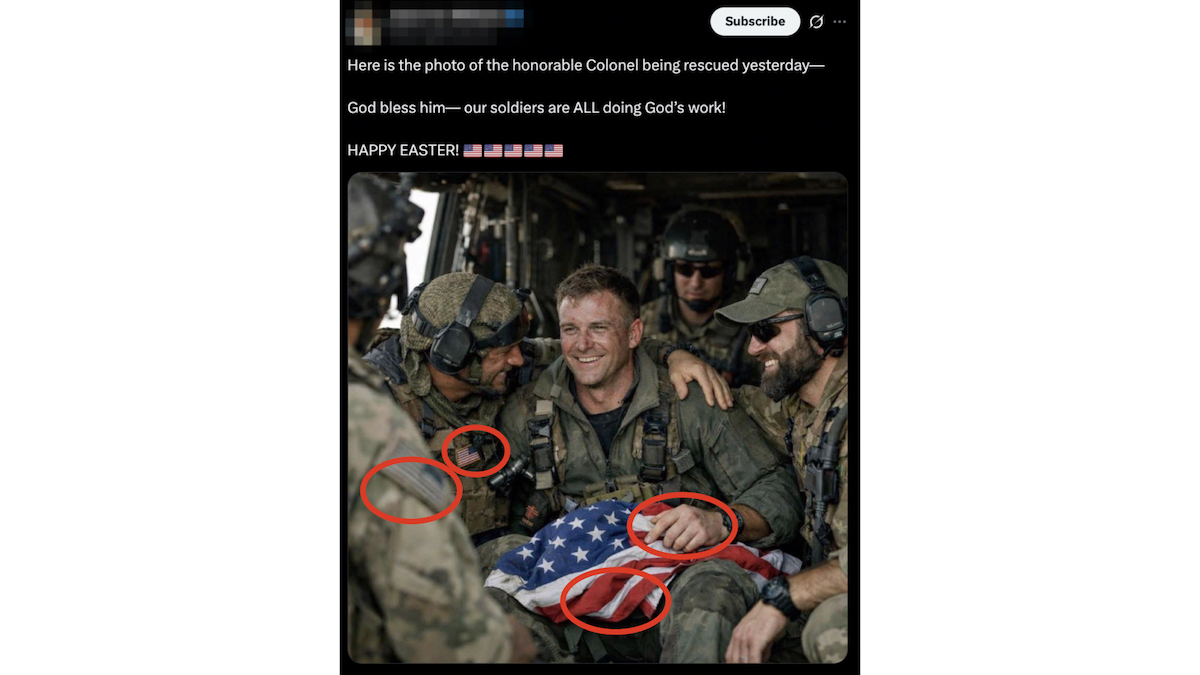 (Screenshot of a purported image of a U.S. colonel's rescue has some visual inconsistencies indicating it was created using AI.)