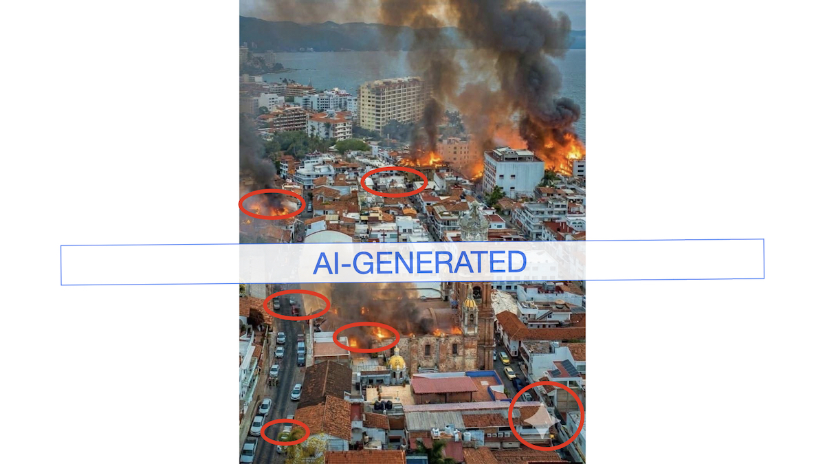 It also shows clues it was AI-generated, some buildings look distorted and the smoke and the fire have unusual patterns; The fire is not consuming the structures and all the smoke is going in the same direction.