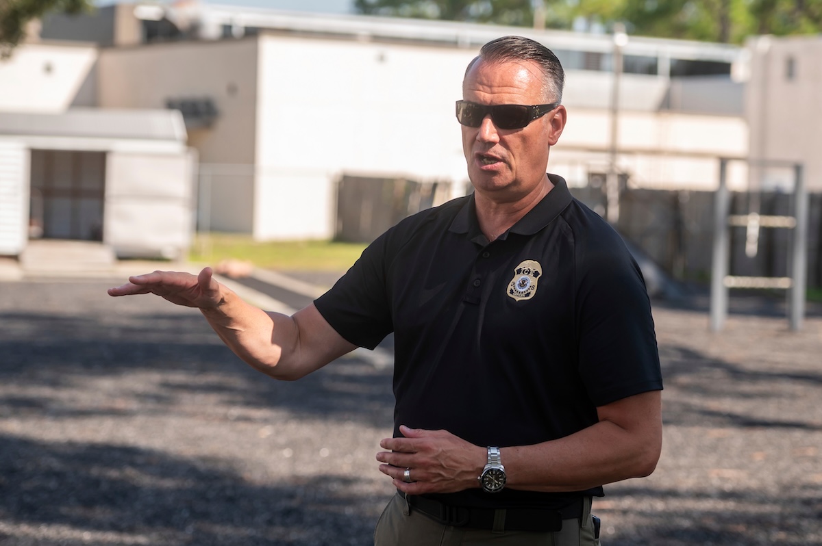 Todd Lyons, acting director of U.S. Immigration and Customs Enforcement speaks to a group of trainees after they completed their time on the firing range at the Federal Law Enforcement Training Centers in Brunswick, Ga., Aug. 21, 2025. (AP)