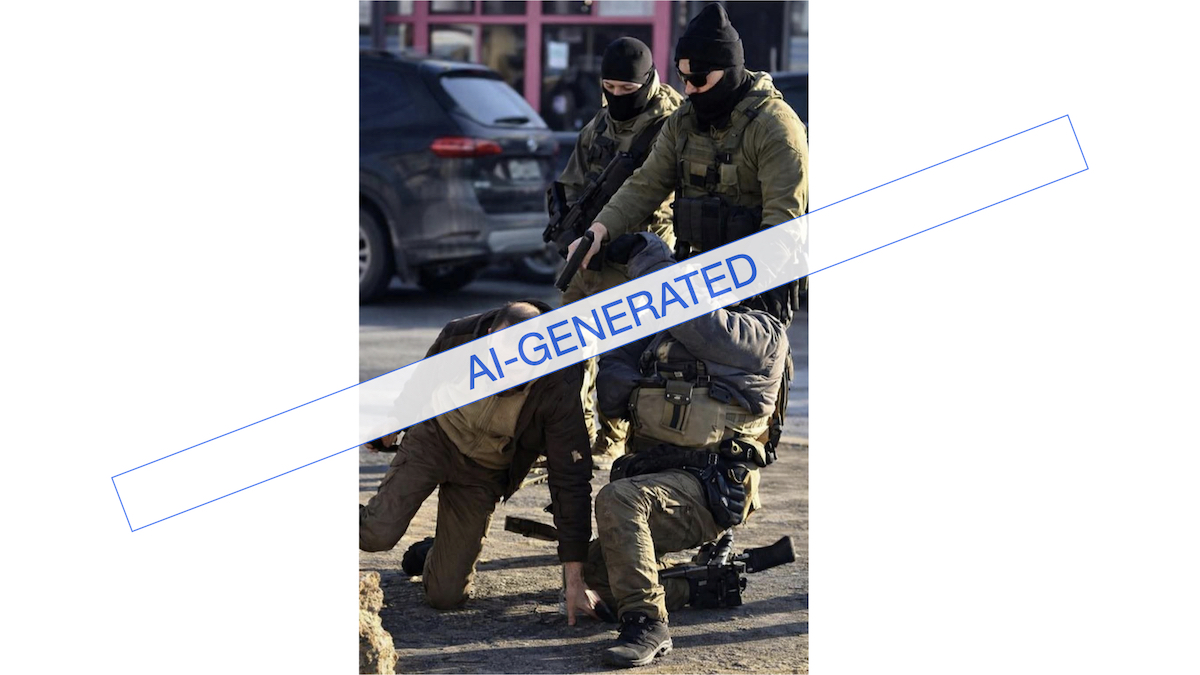 Clues it’s not an authentic photo: One officer is missing his head, and the hands and fingers of Pretti and the agents are distorted.